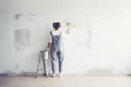 A woman in denim overalls paints a wall with a roller. Photorealistic illustration of Generative AI.