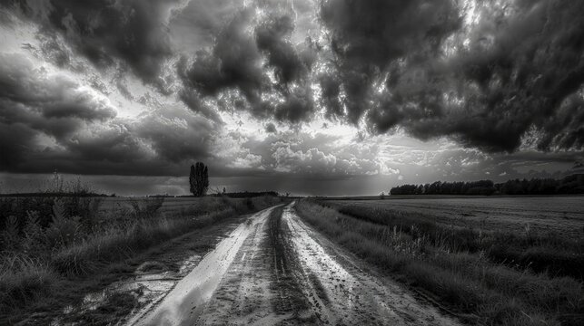 Beautiful cloudy sky in a black and white photograph on a rainy day