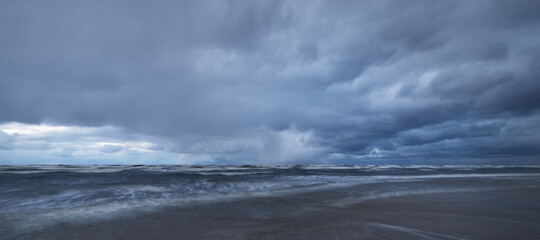 Dark storm sky above the Baltic sea, waves and water splashes. Dramatic cloudscape. Nature, environment, fickle weather, climate change. Atmospheric scenery. Panoramic view, long exposure