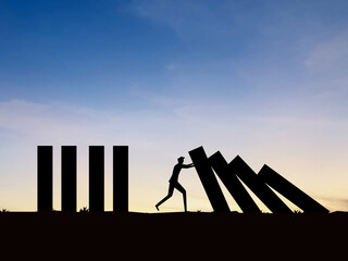 Helping to overcome the crisis, businessman pushes the falling dominoes