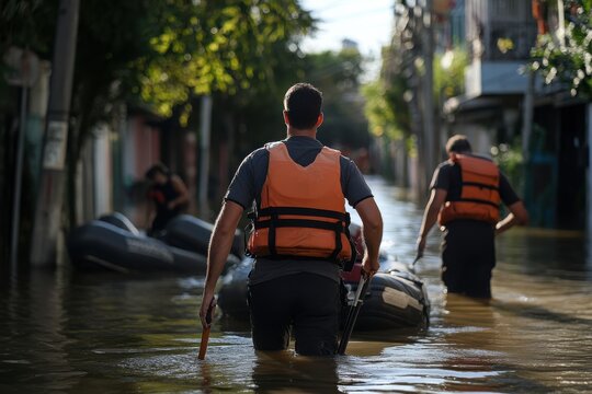 Rescue workers in vibrant vests stride purposefully through floodwaters, their diligence and teamwork underscoring the triumph of human spirit in overcoming adversity smoothly.
