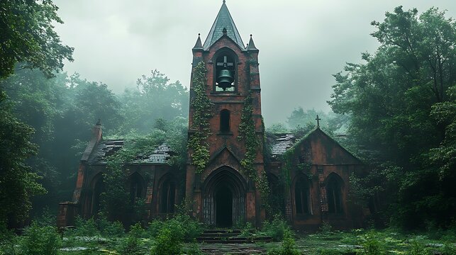 Eerie abandoned gothic ruin with sunbeams through doorway architecture photo