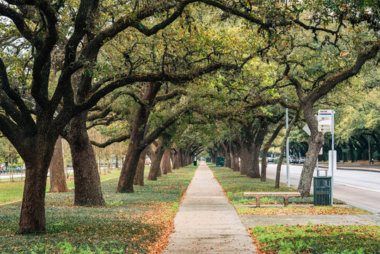 Sunlit park trail with bright autumn trees lining the dirt path, featuring overhanging branches and clear blue sky, during fall season