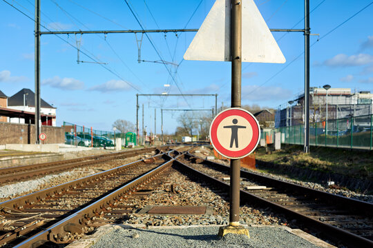 Complex railway tracks converging and separating beneath a bright sky, highlighted by a 'no pedestrians' warning sign. Signifies caution and restricted access.