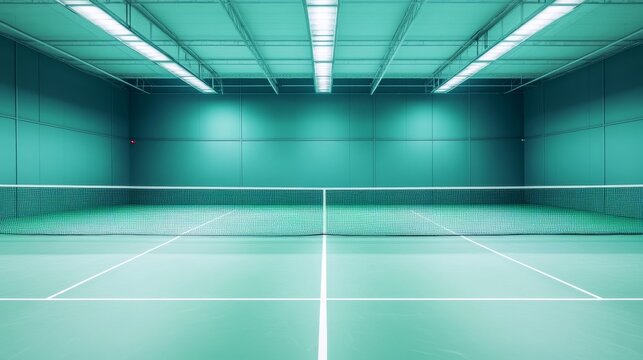 A badminton court's net with the floor texture and boundary lines, indoor setting with overhead lights, Sharp style