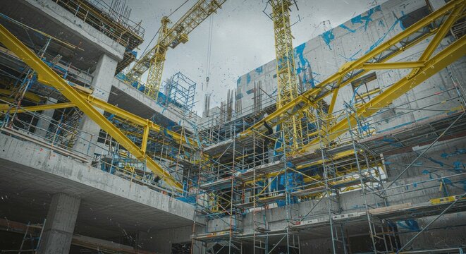 Rusty painted scaffolding panels in vibrant blue, yellow, and red suitable for construction backgrounds or industrial design themes.