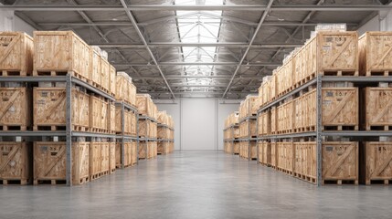 Industrial warehouse interior with stacked pallets in storage