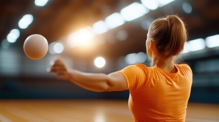 A woman in an orange shirt is seen from behind, ready to throw a ball in a spacious indoor sports arena, with bright overhead lights illuminating the scene.
