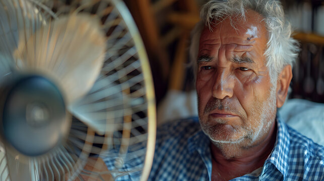 Senior mature grey haired man working at home or at office and suffering from summer heat in front of fan at workplace. Tired upset retired person using electric fan during heatwave