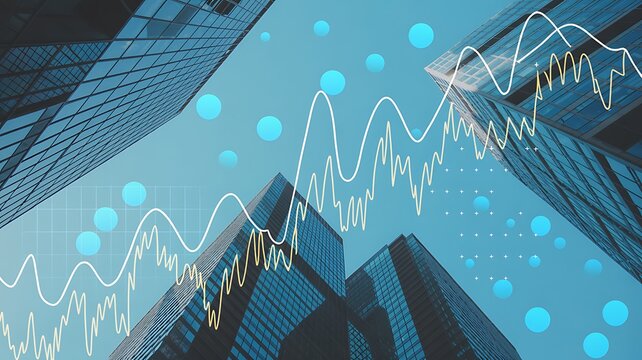 Abstract business concept with financial graphs overlaying modern high rise buildings and blue sky