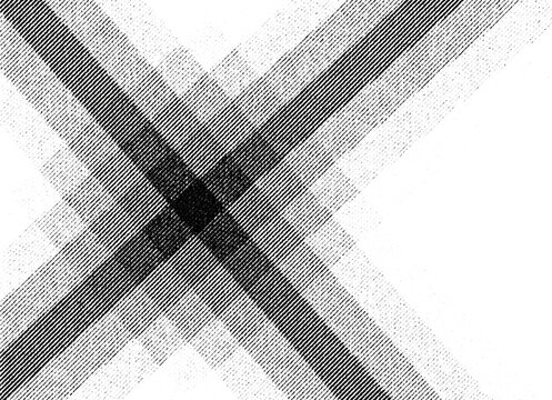 Macro halftone print of overlapping diagonal stripes forming a bold X-shape, created with dense black dot patterns on a transparent background.