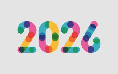 A modern and vibrant design featuring the number 2026 with overlapping colorful digits in pink, blue, green, and orange