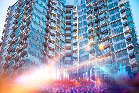 A high-rise apartment building in Hong Kong with an overlay of a financial market crisis concept.