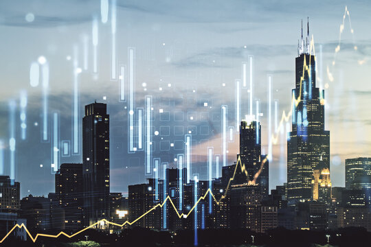 Financial graphs and digital indicators overlap with modernistic urban area, skyscrabber for stock market business concept. Double exposure.