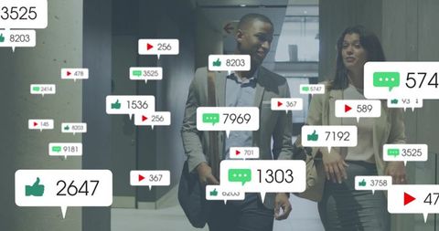 Young professionals walking and chatting with social media notification overlays