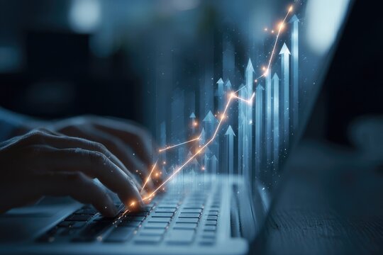 Close-up of hands typing on laptop, overlayed with upward trending graphs