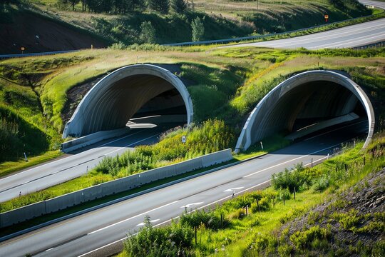 A wildlife overpass blends seamlessly with the natural environment, showcasing sustainable infrastructure.