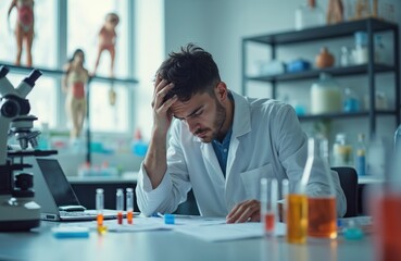 Tired scientist in lab coat sits with head in hands at desk with papers, laptop, microscope, and beakers. Overworked researcher looks stressed, frustrated by experiment results or data.