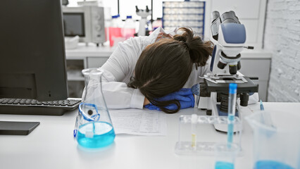 Exhausted hispanic woman scientist resting in laboratory amidst research equipment and paperwork
