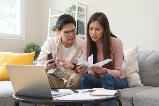 Stressed business woman, employee using calculator to calculate expenses of monthly, hand holding bills and receipt for to payment on table at home. Financial, finance of banking concept