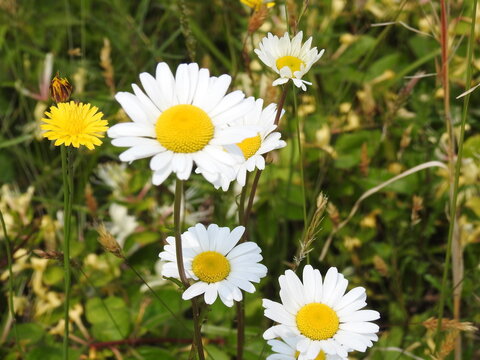 Wildflowers bloomed, oxeye daisies and a common dandelion. Bombay hook National Wildlife Refuge, Kent County, Delaware.