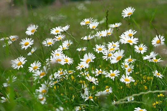 Cose up of blooming white daisies, chamomile with yellow centers growing in a lush meadow background. Oxeye daisy, Leucanthemum vulgare, Common daisy, Dog daisy. Gardening, plant breeding