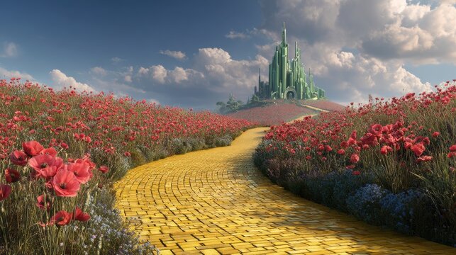 Stunning photo of yellow brick road leading through poppy field to green emerald city in the distance. Wizard of Oz concept.