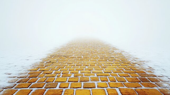 Golden brick road disappearing into fog and snow on either side. Ideal for concepts like journey, dream, success, or overcoming obstacles.