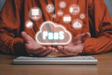 PaaS, Platform as a Service concept. Cloud computing service on software platform. Person using with PaaS icon on virtual screen.