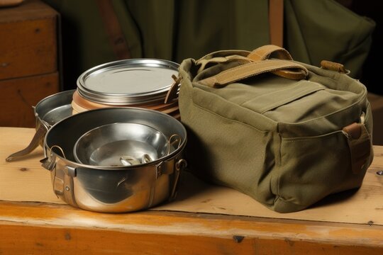Detail view of a soldiers mess kit, carrying the essentials for survival in the field.