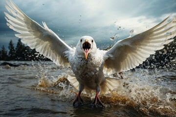 An energetic seagull with an open beak rises aggressively with splashing water from a body of water, AI generated, AI generated