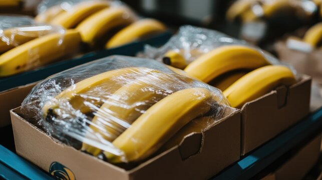 Industrial plastic shrink wrapping machine packaging cartons of bananas in a warehouse setting for efficient logistics and distribution.