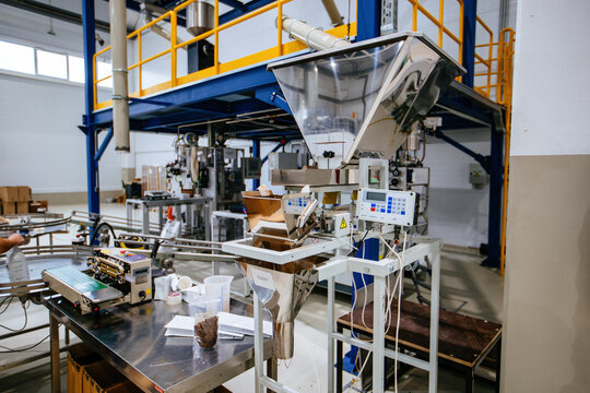 roll of plastic packaging film on the automatic packing machine in food product factory. industrial and technology concept.