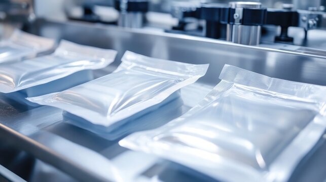 Meat factory worker pack the meat into the plastic foil on the machine at food factory.