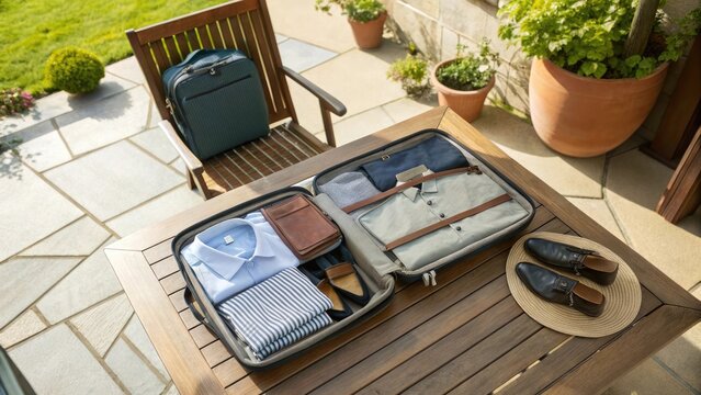 Two men packing suitcase for vacation in relaxed bedroom setting