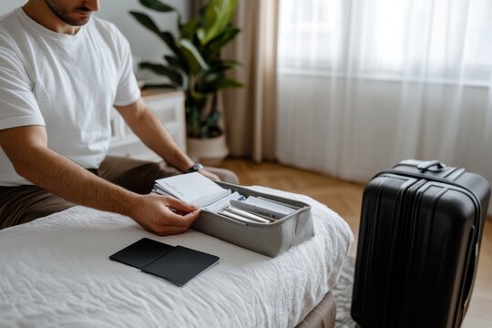 Man packing suitcase in spacious bedroom for a relaxing getaway