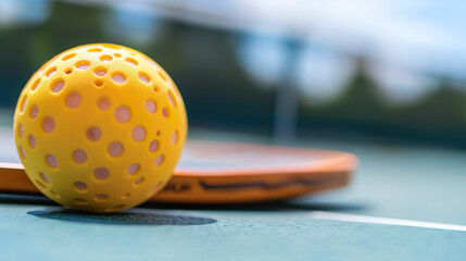 Close detail of a player's hand on a yellow handle grip tape of a carbon fiber pickleball paddle with a ball.