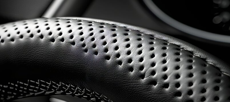 Luxurious black leather steering wheel with elegant silver gear shift paddle close up