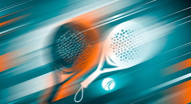 Abstract illustration of padel rackets and a ball in motion with dynamic lines and vibrant colors.