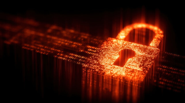 digital lock symbolizing data security and privacy, surrounded by binary code and glowing elements, represents importance of safeguarding information in digital age