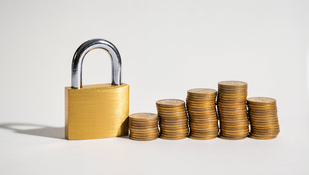 A large, golden padlock sits next to a series of growing coin stacks, creating a visual metaphor for the security and growth of personal finance. This image is financial protection, savings, wealth.