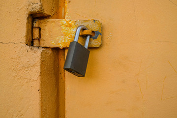 Close up of padlock on metal door