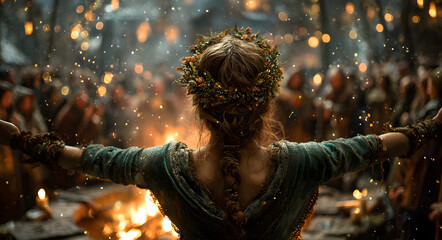 Woman from behind with wreath and lights, dancing around bonfire with blurred crowd during pagan solstice ritual. Yule celebration concepts for winter holiday.