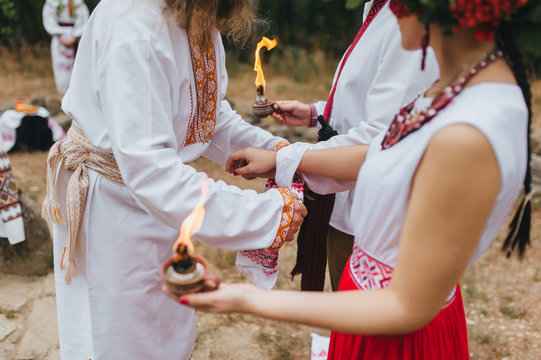 A bearded ataman knotted a knot with a rushnyk to the newlyweds at the wedding ceremony of Ukrainian pagans in embroidered shirts holding candles with fire. Photography, concept.