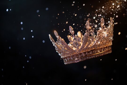 A beauty pageant crown featuring crystal details against a black and gold abstract background, showcasing grandeur