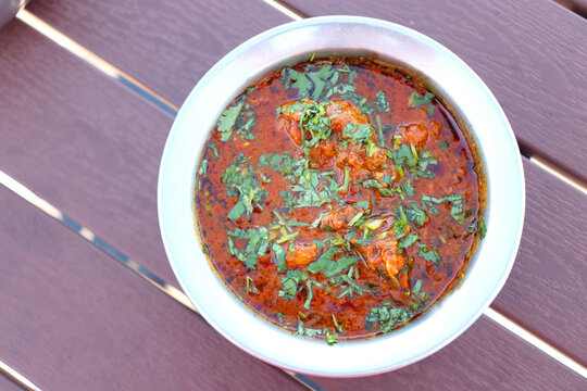 hicken curry. Pahadi chicken masala is a famous Spicy nonvegetarian dish of north India. It's made out of chicken meat along with spices and garnished with fresh coriander. copy space.