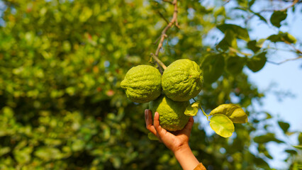 Fresh raw lemons hanging on the tree. Hand holding a bunch of green limes or lemons. Large citrus known as Hill lemon, Pahadi lemon, Citron or Galgal growing on plant. Use for kidney stone disease