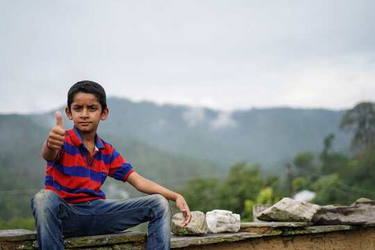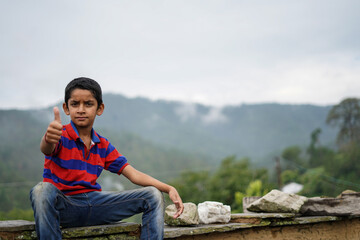 Portrait of a indian pahadi kid who belongs to the mountains showing thumbs up to the camera.