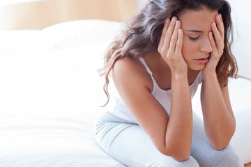 Middle-aged woman experiencing abdominal pain on bedroom bed