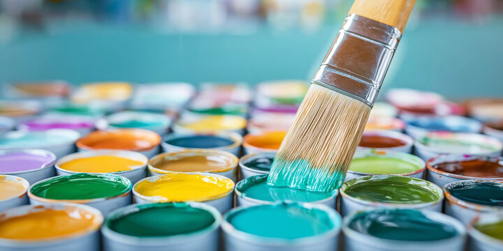 Paintbrush dipping into vibrant turquoise paint among many colorful cans, showing art, creativity, and color selection
